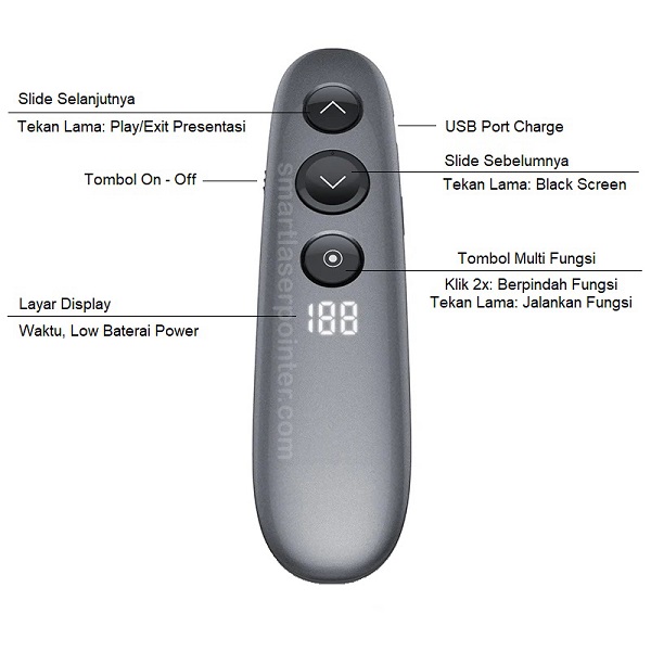 Laser pointer presenter presentasi kini mengganti penggunaan anak panah atau mouse saat Anda masih melakukan presentasi di depan laptop Anda. Tombol kontrol untuk menjalankan slide powerpoint, didesain dengan fungsi yang sama dengan tombol anak panah di laptop Anda.