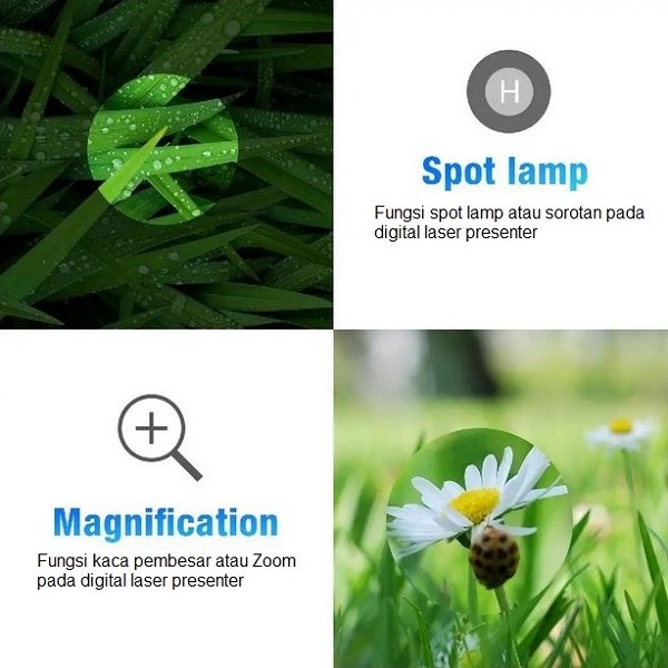 Laser pointer presenter presentasi mengganti penggunaan anak panah di papan ketik Anda atau mouse saat presentasi. Produk ini memiliki fungsi yang sama dengan tombol anak panah di keyboard Anda, tetapi menggunakan teknologi wireless (tanpa kabel)
